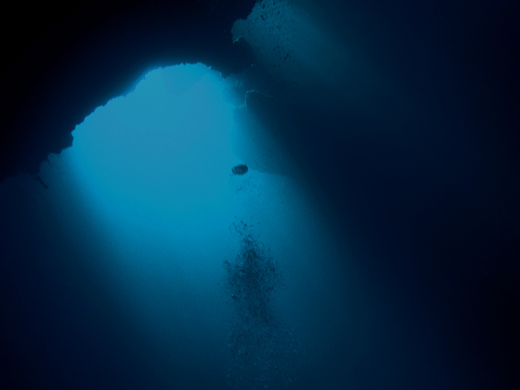 "you'll know what I mean when you've ever looked down in quiet water while floating over the edge of an abyss where you see light blue and green aquatic life and then within a few meters it becomes dark blue, near black at a horribly steep descent."
